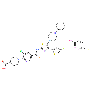 分子式:C29H34N6O3S2Cl2.C4H4O4,分子量:765.72682,纯度: > 98%,溶解性: (R.T.: 25℃): DMSO,Avatrombopag(AKR-501; AS1670542) is a novel orally-active thrombopoietin(TPO) receptor agonist with EC50 of 3.3 nM.