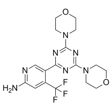 分子式:C17H20F3N7O2,分子量:411.38,纯度: > 98%,溶解性: (R.T.: 25℃): DMSO,Bimiralisib (PQR309) 是一种可渗透脑的,PI3K/mTOR制剂,PI3Kα, PI3Kδ, PI3Kβ, PI3Kγ 和 mTOR,IC50 分别为 33 nM,451 nM,661 nM,708 nM 和 89 nM。Bimiralisib 是 mTORC1 和 mTORC2制剂。