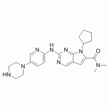 分子式:C₂₃H₃₀N₈O 分子量:434.54 纯度: > 98% 溶解性: (R.T.: 25℃): DMSO,Ribociclib (LEE011) 是一种高度特异性的 CDK4/6 **剂,IC50 值分别为 10 nM 和 39 nM,对 cyclin B/CDK1 复合体的活性低于其 1000 倍。
