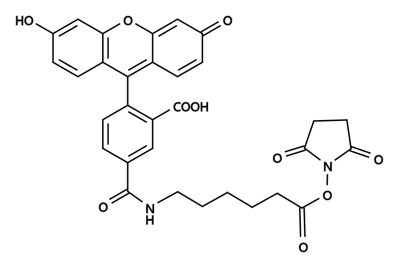 西安齐岳生物科技有限公司生产销售“5-SFX|5-FAM-X, SE|CAS148356-00-7|5-羧基荧光素琥珀酰亚胺酯”“分子量:586.54,激发(nm):493,发射(nm):517,5-FAM-X,SE在FAM荧光团和琥珀酰亚胺酯之间包含氨基己基间隔基(称为“ X”)。“ X”间隔基将荧光团与与其结合的生物分子分开。“ X”间隔基可潜在地减少通常在荧光素分子与蛋白质或其他生物聚合物(例如核酸)缀合时发生的猝灭。”,该产品仅用于科研,如果需要请联系我们
