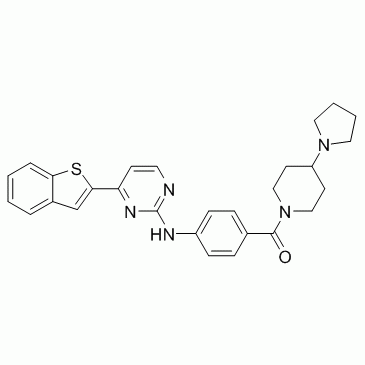 分子式:C33H32N4O4 ,分子量:548.63 ,纯度: > 98% ,溶解性: (R.T.: 25℃): DMSO,ICG-001拮抗Wnt/β-catenin/TCF介导的转录,并特异性结合到启动子结合蛋白(CBP),IC50为3 μM,但不能结合到相关的转录共激活因子p300上。