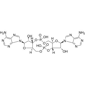 西安齐岳生物科技有限公司生产销售“c-di-AMP Cyclic diadenylate,CAS54447-84-6”“分子式:C20H24N10O12P2,分子量:658.41,纯度: > 98%,溶解性: (R.T.: 25℃): DMSO,c-di-AMP (Cyclic diadenylate) 是 STING 激动剂,其与 STING 结合,从而激活 TBK3-IRF3 信号传导途径,随后引发 I 型 IFN 和 TNF 产生。”,该产品仅用于科研,如果需要请联系我们