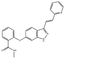 Axitinib is a multi-target inhibitor of VEGFR1, VEGFR2, VEGFR3, PDGFRβ and c-Kit with IC50 of 0.1 nM, 0.2 nM, 0.1-0.3 nM, 1.6 nM and 1.7 nM in Porcine aorta endothelial cells, respectively.