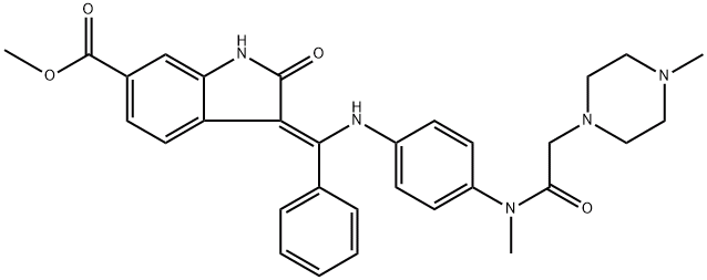 Nintedanib (BIBF 1120) cas:656247-17-5 Nintedanib (BIBF 1120) is a potent triple angiokinase inhibitor for VEGFR1/2/3, FGFR1/2/3 and PDGFRα/β with IC50 of 34 nM/13 nM/13 nM, 69 nM/37 nM/108 nM and 59 nM/65 nM in cell-free assays. Phase 3.