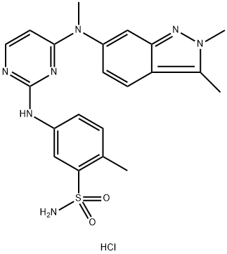 Pazopanib HCl (GW786034 HCl) is a novel multi-target inhibitor of VEGFR1, VEGFR2, VEGFR3, PDGFR, FGFR, c-Kit and c-Fms with IC50 of 10 nM, 30 nM, 47 nM, 84 nM, 74 nM, 140 nM and 146 nM in cell-free assays, respectively.