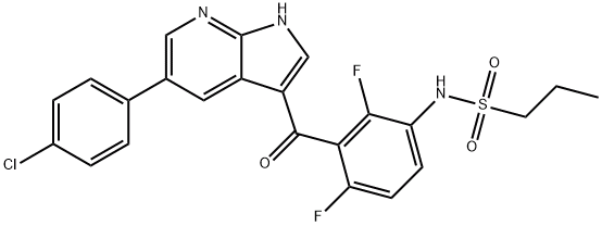 Vemurafenib (PLX4032, RG7204) is a novel and potent inhibitor of B-RafV600E with IC50 of 31 nM in cell-free assay. 10-fold selective for B-RafV600E over wild-type B-Raf in enzymatic assays and the cellular selectivity can exceed 100-fold.