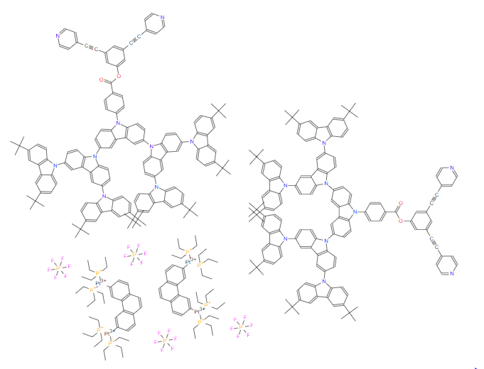 SMILES:CC(C)(C)C1=CC2=C(C=C1)N(C1=CC3=C(C=C1)N(C1=CC4=C(C=C1)N(C1=CC=C(C(=O)OC5=CC(C#CC6=CC=NC=C6)=CC(C#CC6=CC=NC=C6)=C5)C=C1)C1=CC=C(N5C6=C(C=C(N7C8=C(C=C(C(C)(C)C)C=C8)C8=CC(C(C)(C)C)=CC=C87)C=C6)C6=CC(N7C8=C(C=C(C(C)(C)C)C=C8)C8=CC(C(C)(C)C)=CC=C87)=CC=C65)C=C41)C1=CC=C(N4C5=C(C=C(C(C)(C)C)C=C5)C5=CC(C(C)(C)C)=CC=C54)C=C31)C1=CC=C(C(C)(C)C)C=C21.CC(C)(C)C1=CC2=C(C=C1)N(C1=CC3=C(C=C1)N(C1=CC4=C(C=C1)N(C1=CC=C(C(=O)OC5=CC(C#CC6=CC=NC=C6)=CC(C#CC6=CC=NC=C6)=C5)C=C1)C1=CC=C(N5C6=C(C=C(N7C8=C(C=C(C(C)(C)C)C=C8)C8=CC(C(C)(C)C)=CC=C87)C=C6)C6=CC(N7C8=C(C=C(C(C)(C)C)C=C8)C8=CC(C(C)(C)C)=CC=C87)=CC=C65)C=C41)C1=CC=C(N4C5=C(C=C(C(C)(C)C)C=C5)C5=CC(C(C)(C)C)=CC=C54)C=C31)C1=CC=C(C(C)(C)C)C=C21.CC[P-](CC)(CC)[Pt+3](C1=CC2=C(C=C1)C=CC1=C2C=C([Pt+3]([P-](CC)(CC)CC)[P-](CC)(CC)CC)C=C1)[P-](CC)(CC)CC.CC[P-](CC)(CC)[Pt+3](C1=CC2=C(C=C1)C=CC1=C2C=C([Pt+3]([P-](CC)(CC)CC)[P-](CC)(CC)CC)C=C1)[P-](CC)(CC)CC.F[P-](F)(F)(F)(F)F.F[P-](F)(F)(F)(F)F.F[P-](F)(F)(F)(F)F.F[P-](F)(F)(F)(F)F