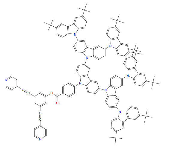 SMILES:CC(C)(C)C1=CC=C2C(=C1)C1=C(C=CC(C(C)(C)C)=C1)N2C1=CC=C2C(=C1)C1=C(C=CC(N3C4=CC=C(C(C)(C)C)C=C4C4=C3C=CC(C(C)(C)C)=C4)=C1)N2C1=CC=C2C(=C1)C1=C(C=CC(N3C4=CC=C(N5C6=CC=C(C(C)(C)C)C=C6C6=C5C=CC(C(C)(C)C)=C6)C=C4C4=C3C=CC(N3C5=CC=C(C(C)(C)C)C=C5C5=C3C=CC(C(C)(C)C)=C5)=C4)=C1)N2C1=CC=C(C(=O)OC2=CC(C#CC3=CC=NC=C3)=CC(C#CC3=CC=NC=C3)=C2)C=C1