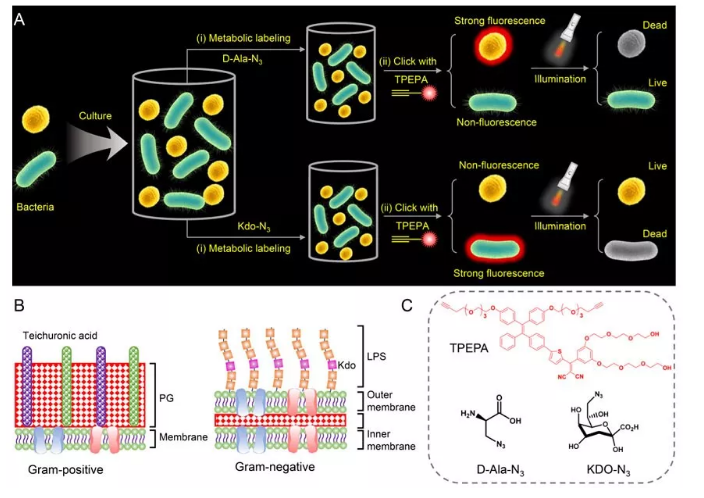 具有聚集诱导发光特性的光敏剂;一种基于生物正交原理的可快速**辨别和杀伤革兰氏阴性、阳性细菌的功能探针TPEPA