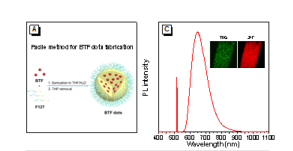 AIE染料BTF,它结构中有强电子供体三苯胺(TPA)、叔丁基(t-Bu)基团和电子受体富马腈(FN)。BTF具有**的供体-受体(D-A)结构,使分子具有FR/NIR发射和**的多光子吸收的能力。BTF可以溶解于常见有机溶剂中,但不溶于水。