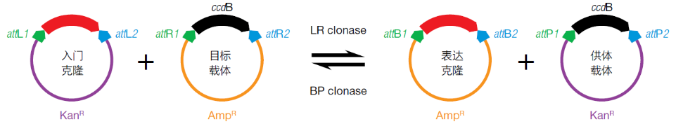 使用 Gateway BP Clone Enzyme可以使两端带有 attB 位点的基因片段和供体载体 (pDONR) 接合形成入门载体 (The Entry Clone)。Gateway 克隆体系在细菌转化这个环节使用正向筛选(抗生素)和负向筛选(ccdB 致死基因)两种选择,以确保得到高比例的阳性重组。