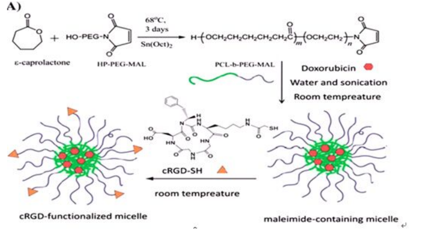 如果我们需要胶束具有主动靶向作用,就需要在胶束表面修饰多肽、蛋白、糖类、叶酸或抗体等等,这就需要我们在材料的亲水段末端带有活性基团,使得胶束表面的活性基团可以跟多肽、蛋白、糖类等反应结合。