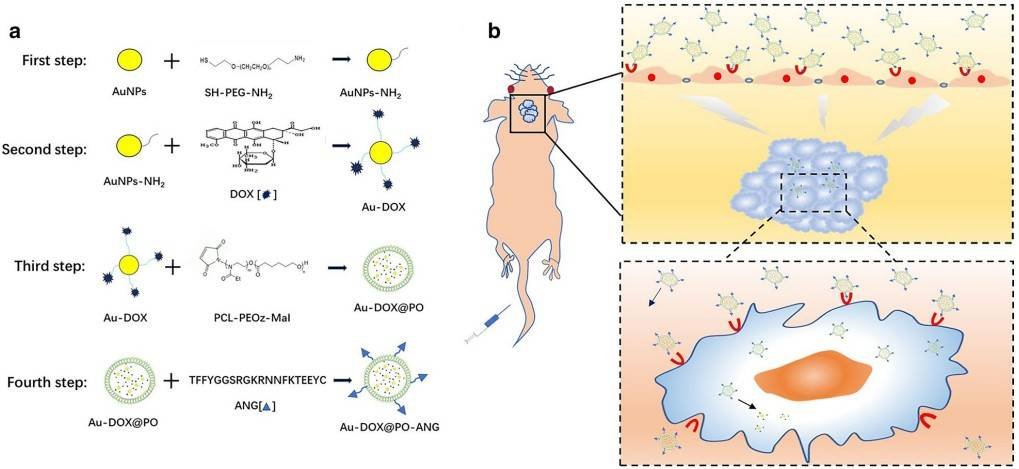 科研学者经过研究发现纳米金偶联**DOX修饰多聚体多肽(Au-DOX@PO-ANG)具有良好的通过血脑屏障和靶向**的能力,并且重组蛋白(LRP1)能使****通过血脑屏障进入中枢神经系统,成为胶质母细胞瘤的****靶点,传送具有敏感性和环境响应能力,金纳米颗粒和阿霉素可改善胶质母细胞瘤的放疗(RT)效果,并且用Au-DOX@PO-ANGNPs处理的小鼠**体积明显减少。
