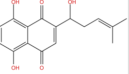 紫草素(Shikonin)是一种有机物,化学式为C16H16O5,具有不溶于水,溶于乙醇、有机溶剂和植物油,易溶于碱水,遇酸又沉淀析出的性质。系由天然植物宗阜根中所提取的紫红色萘醌类天然色素,主要成分是紫草醌及其衔生物,包括紫草素、B,p'-二甲基丙烯酰紫草素(p,p'-dimethylacryl Shikonin)、p羟基异戊酰紫草素(p-hydaro-xyisovaleryl shikonin )、异戊酰紫草素(isovaleryl shikonin)、去氧紫草素(deoxy shikonim) 等。