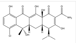 金霉素(chlortetracycline),化学名为氯四环素,化学式为C22H23ClN2O8,是一种金色黄色晶体粉末,由金色链霉菌发酵产生,发酵液经酸化、过滤得沉淀物,溶解于乙醇后经酸析得粗品,经溶解、成盐得盐酸盐结晶。