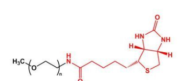 mPEG-Biotin可以高亲和力结合抗生物素蛋白或抗生蛋白链菌素。 聚乙二醇化生物素可溶于水溶液,无需添加任何有机溶剂即可直接用于缓冲液中。
