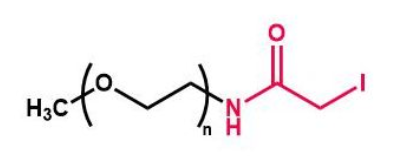 碘乙酰基(IA)功能化的聚乙二醇(IA PEG)是硫醇(-SH)基反应性PEG衍生物,可用于通过其可用的硫醇基团修饰生物分子或其他材料。 碘基很容易被硫醇基取代,形成一个稳定的碳硫醇键。