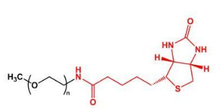 mPEG-Biotin可以高亲和力结合抗生物素蛋白或抗生蛋白链菌素。 聚乙二醇化生物素可溶于水溶液,无需添加任何有机溶剂即可直接用于缓冲液中。