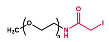 碘乙酰基(IA)功能化的聚乙二醇(IA PEG)是硫醇(-SH)基反应性PEG衍生物,可用于通过其可用的硫醇基团修饰生物分子或其他材料。 碘基很容易被硫醇基取代,形成一个稳定的碳硫醇键。