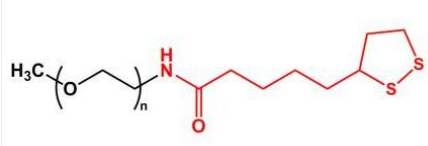 硫辛酸是参与各种生物过程的重要生物活性分子。 PEG官能化的硫辛酸可用于通过其-S-S键与金属颗粒或膜表面结合。 硫辛酸基团对金属表面具有高亲和力,已被广泛用于金纳米颗粒和量子点表面。 聚乙二醇硫辛酸是水溶性的,可以直接用于水性缓冲液中。