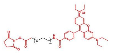 罗丹明用于追踪红色或粉红色荧光。活性酯可以与伯胺基在PH7-8.5条件下生成稳定的酰胺键。修饰性PEG广泛应用于修饰蛋白类**、肽类化合物、有机小分子**、生物材料等。